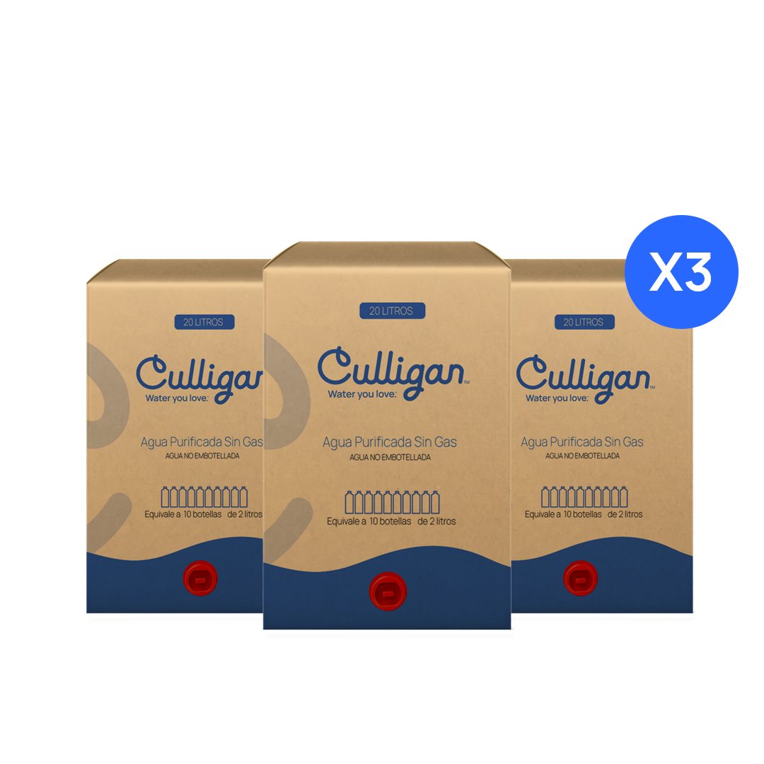 Disfruta de la máxima pureza con el sistema Aquabag de 20 litros, una innovación exclusiva de Culligan diseñada para optimizar el espacio y cuidar el medio ambiente. A diferencia de los bidones rígidos tradicionales, este formato flexible utiliza significativamente menos plástico y es 100% reciclable, reduciendo la huella de carbono de tu empresa u hogar. Es el repuesto ideal para dispensadores Culligan compatibles, garantizando agua libre de sodio, cloro y metales pesados, perfecta para una hidratación saludable diaria.